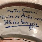 Además se detectaron intervenciones anteriores consistentes en uniones entre piezas con pegamento, las cuales, a criterio del equipo técnico de restauradores de la SNC, no habían sido bien resueltas, ya que las partes no se correspondían correctamente sin seguir los diseños plasmados por el autor. Por este motivo, se procedió primeramente a realizar una investigación exhaustiva de la pieza que según firma del artista, la obra fue hecha en 1930 por Julián de la Herrería. Con letra y puño del autor se señala lo siguiente: “Motivo Guaraní. El Mito de Moñai – Cuare… firma: Julián de la Herrería, 1930”.