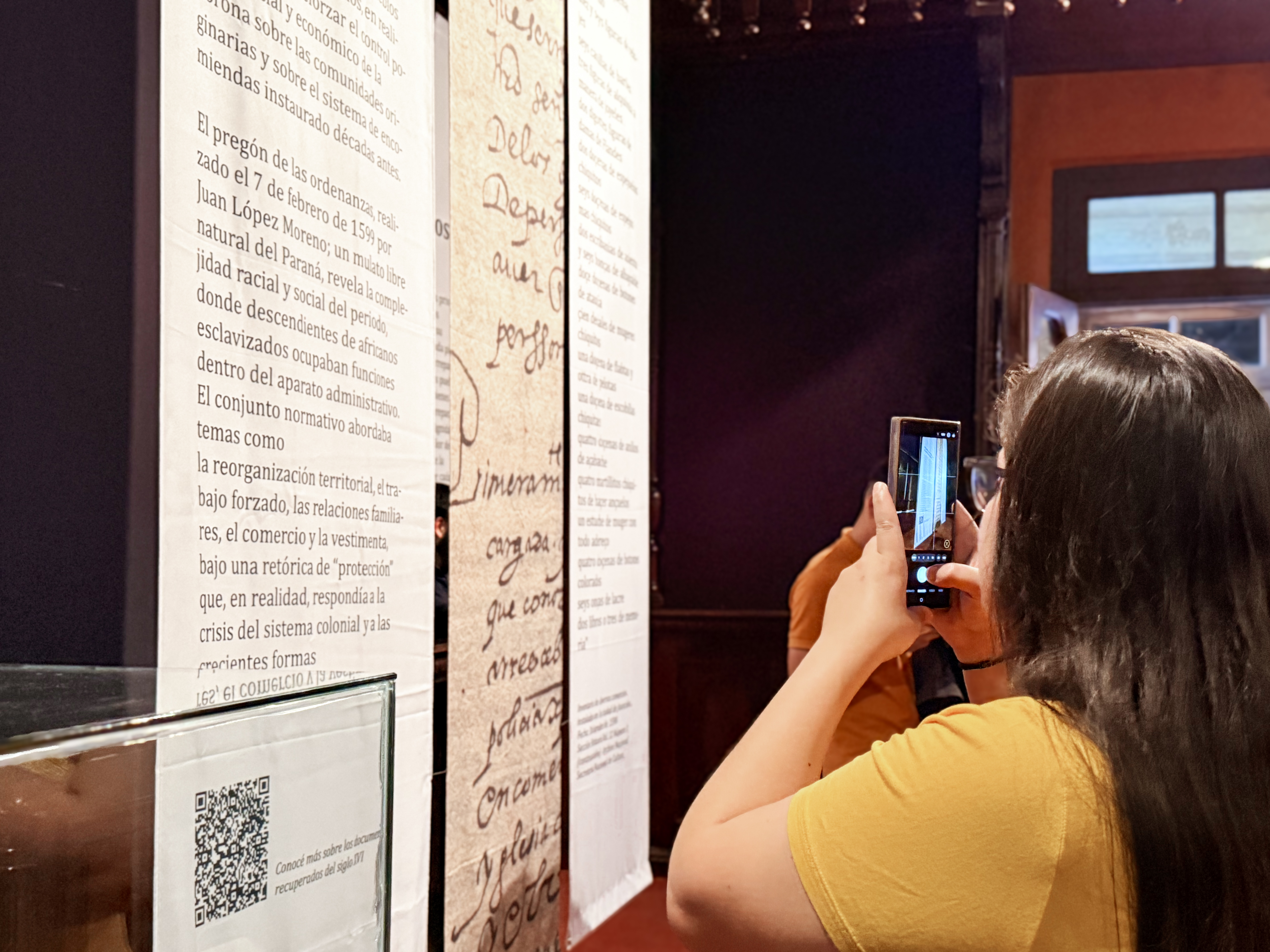 La propuesta expositiva combina documentos originales, textos explicativos, elementos visuales y recursos digitales. Las vitrinas incluyen fragmentos destacados y banderolas informativas que facilitan la lectura, mientras que los códigos QR permiten acceder a entrevistas con especialistas y materiales complementarios sobre el proceso de restitución y la prevención del tráfico ilícito de bienes culturales.