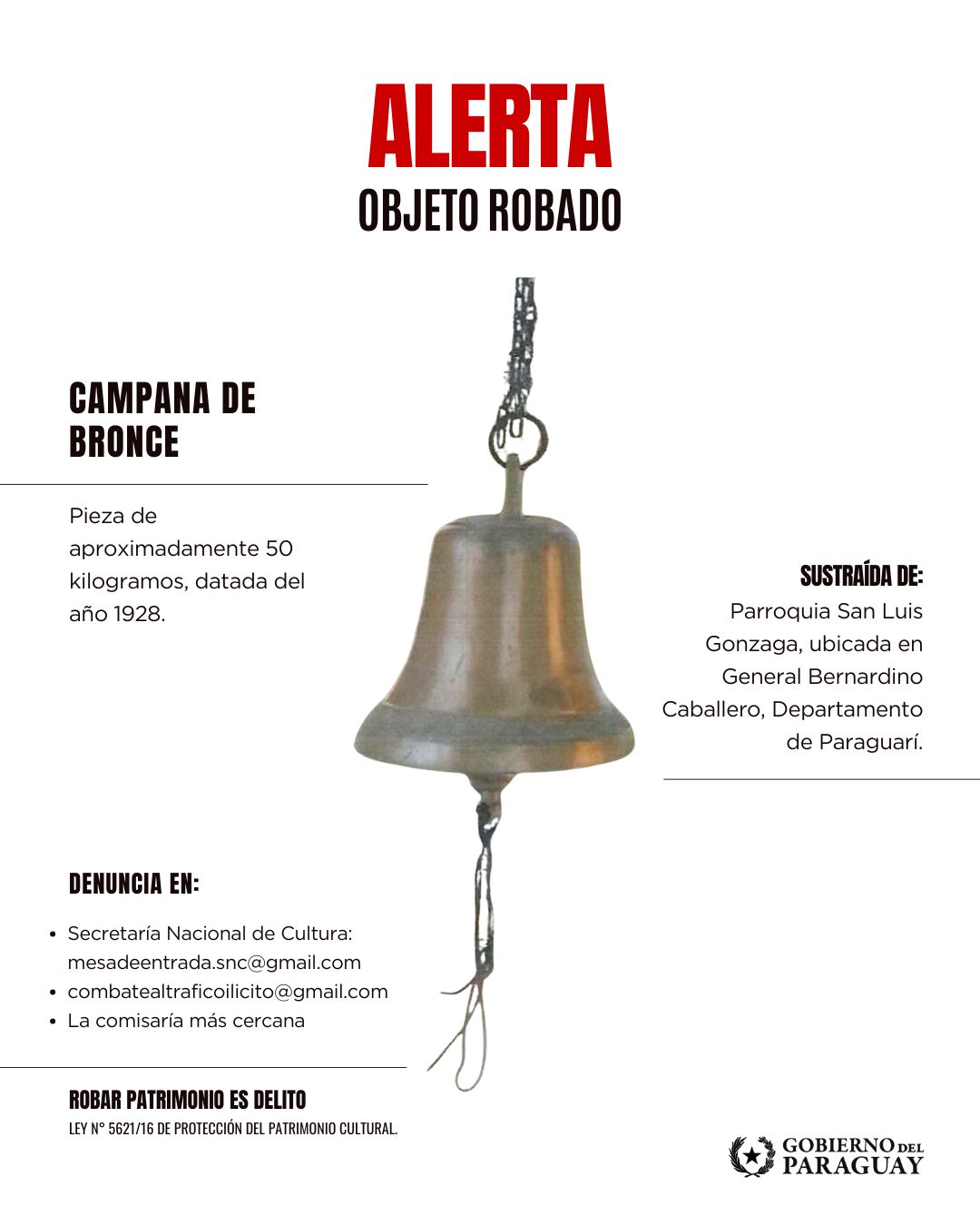 La Secretaría Nacional de Cultura alerta sobre el presunto robo de una campana de bronce perteneciente a la parroquia San Luis Gonzaga, ubicada en la ciudad de General Bernardino Caballero, departamento de Paraguarí.