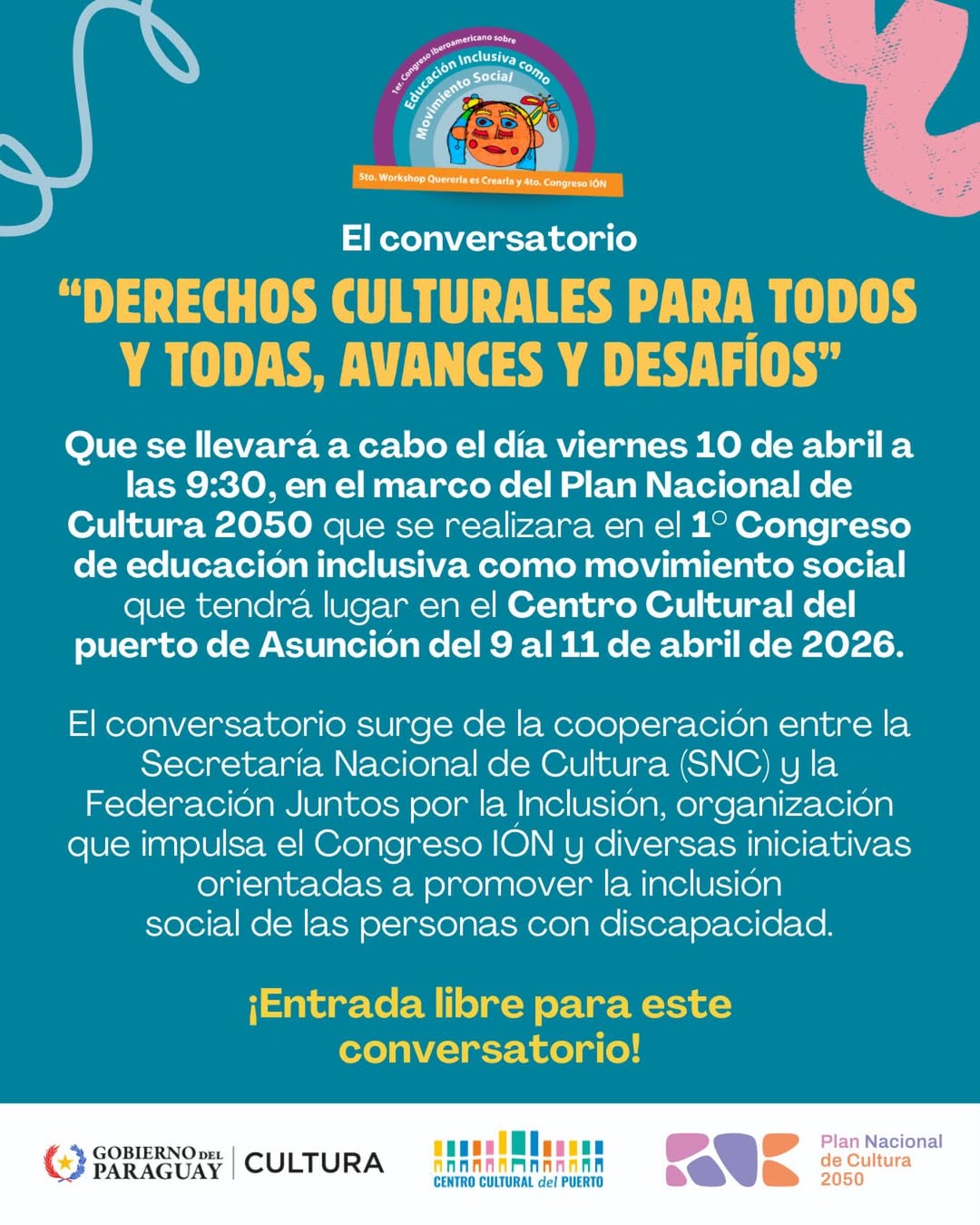 La Secretaría Nacional de Cultura invita a la ciudadanía a participar del conversatorio “Derechos culturales para todos y todas: avances y desafíos”, que se llevará a cabo el viernes 10 de abril, a las 09:30 horas, en el Centro Cultural del Puerto de Asunción, con acceso libre y gratuito.